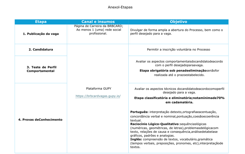 - A realização do processo e aprovação não implica em obrigação de contratação por parte da BRBCARD, que realizará o preenchimento das vagas conforme sua disponibilidade orçamentária e interesse.