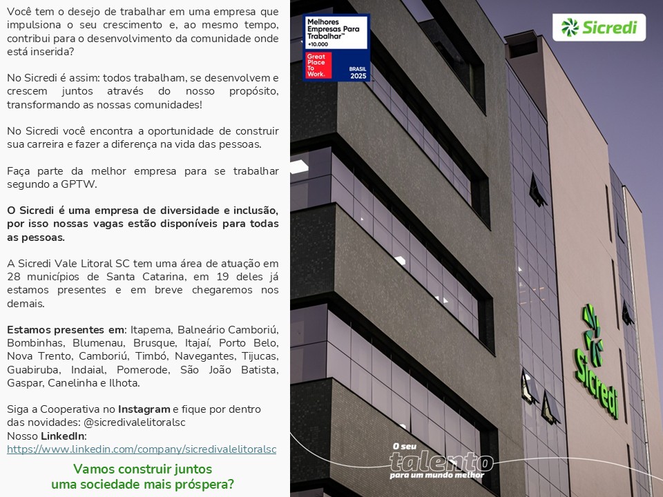 Obs.: Vaga para trabalho presencial na cidade de Itapema/SC.