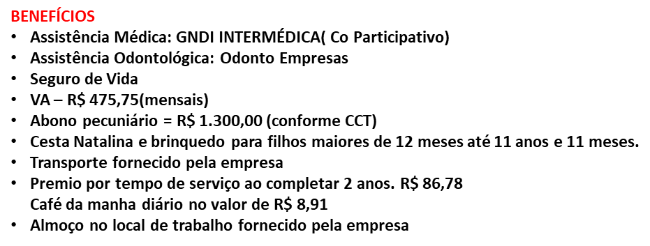 - Almoço no Local de trabalho fornecido pela empresa.