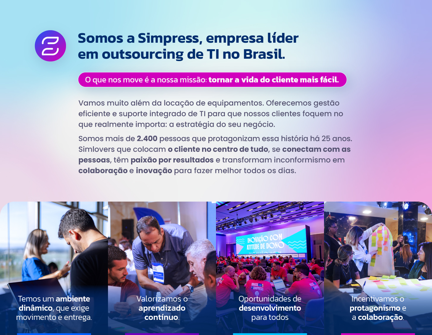 Venha fazer parte da Simpress, líder em outsourcing de TI no Brasil! O que nos move é a nossa missão: tornar a vida do cliente mais fácil. Temos um ambiente inovador, que exige movimento e entrega. Valorizamos o aprendizado contínuo e oferecemos oportunidades para que todo profissional se desenvolva, assuma o protagonismo da sua jornada e impulsione sua carreira. Se você se conecta com o nosso jeito de ser, junte-se ao nosso time de #Simlovers!
