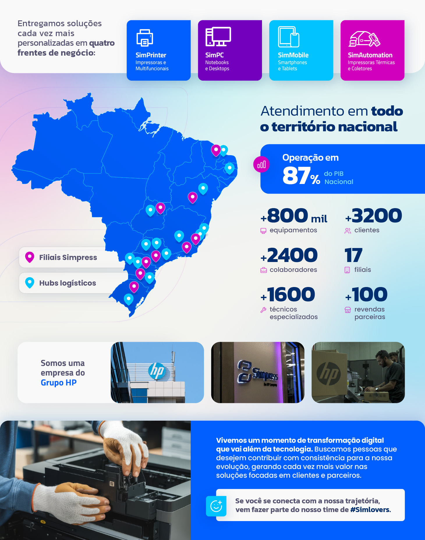 Venha fazer parte da Simpress, líder em outsourcing de TI no Brasil! O que nos move é a nossa missão: tornar a vida do cliente mais fácil. Temos um ambiente inovador, que exige movimento e entrega. Valorizamos o aprendizado contínuo e oferecemos oportunidades para que todo profissional se desenvolva, assuma o protagonismo da sua jornada e impulsione sua carreira. Se você se conecta com o nosso jeito de ser, junte-se ao nosso time de #Simlovers!