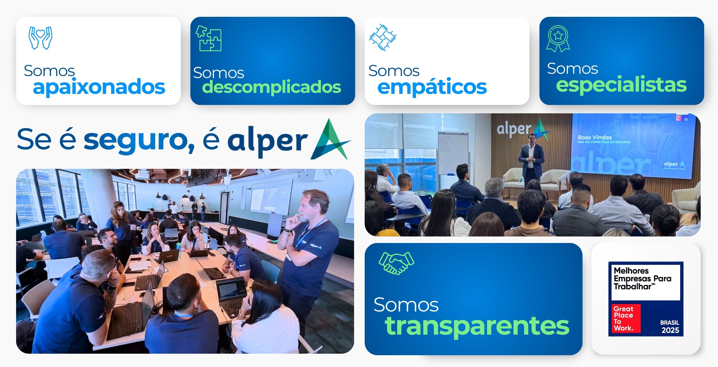 Na Alper Seguros, transformar negócios e desenvolver pessoas são diretrizes que se unem e guiam nossos cinco valores: Ser Apaixonado, Descomplicado, Especialista, Empático e Transparente. Eles nos conectam ao nosso propósito: “Entregar para o mercado as mais eficientes soluções de seguros, por meio de relações de confiança”. Para impulsionar esse direcionamento, adotamos uma postura consultiva junto aos nossos clientes, internos e externos, oferecendo momentos de desenvolvimento contínuo.