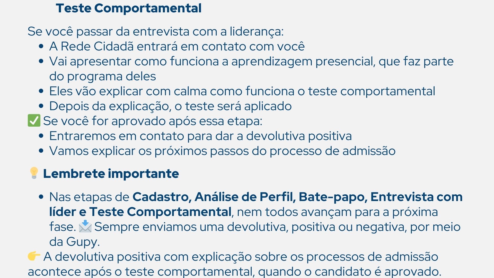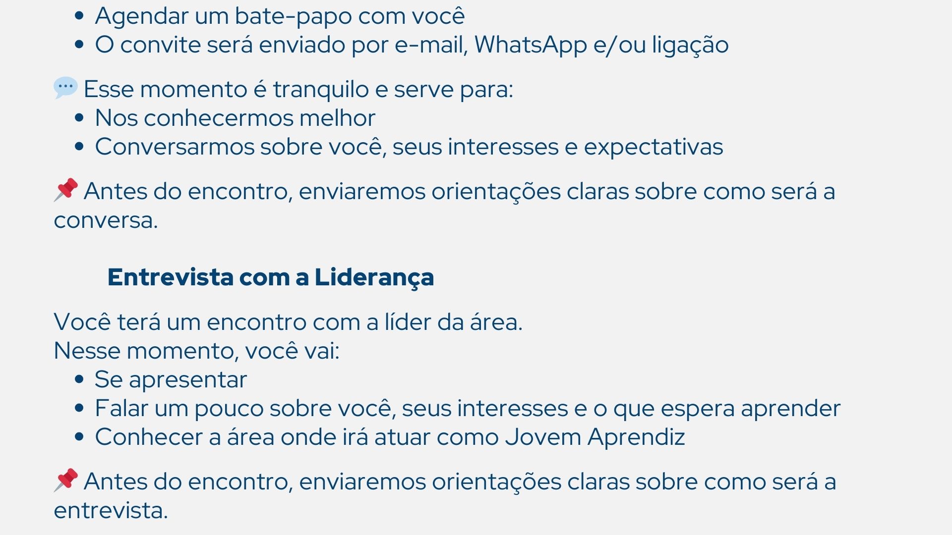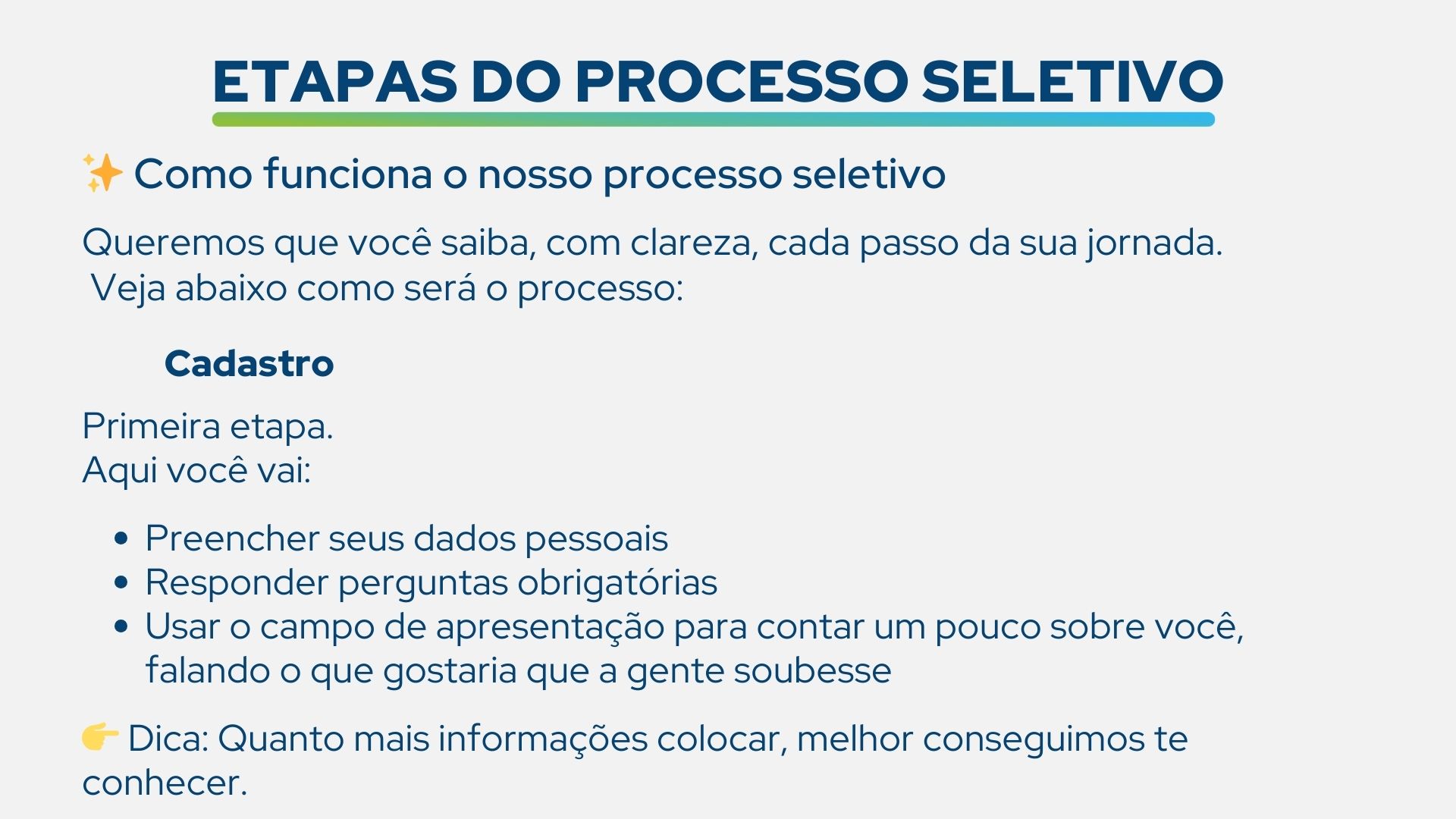 Mais do que uma vaga, essa é uma oportunidade para adquirir experiência profissional, aprender aos poucos e trabalhar em um ambiente que valoriza o respeito e a diversidade.
